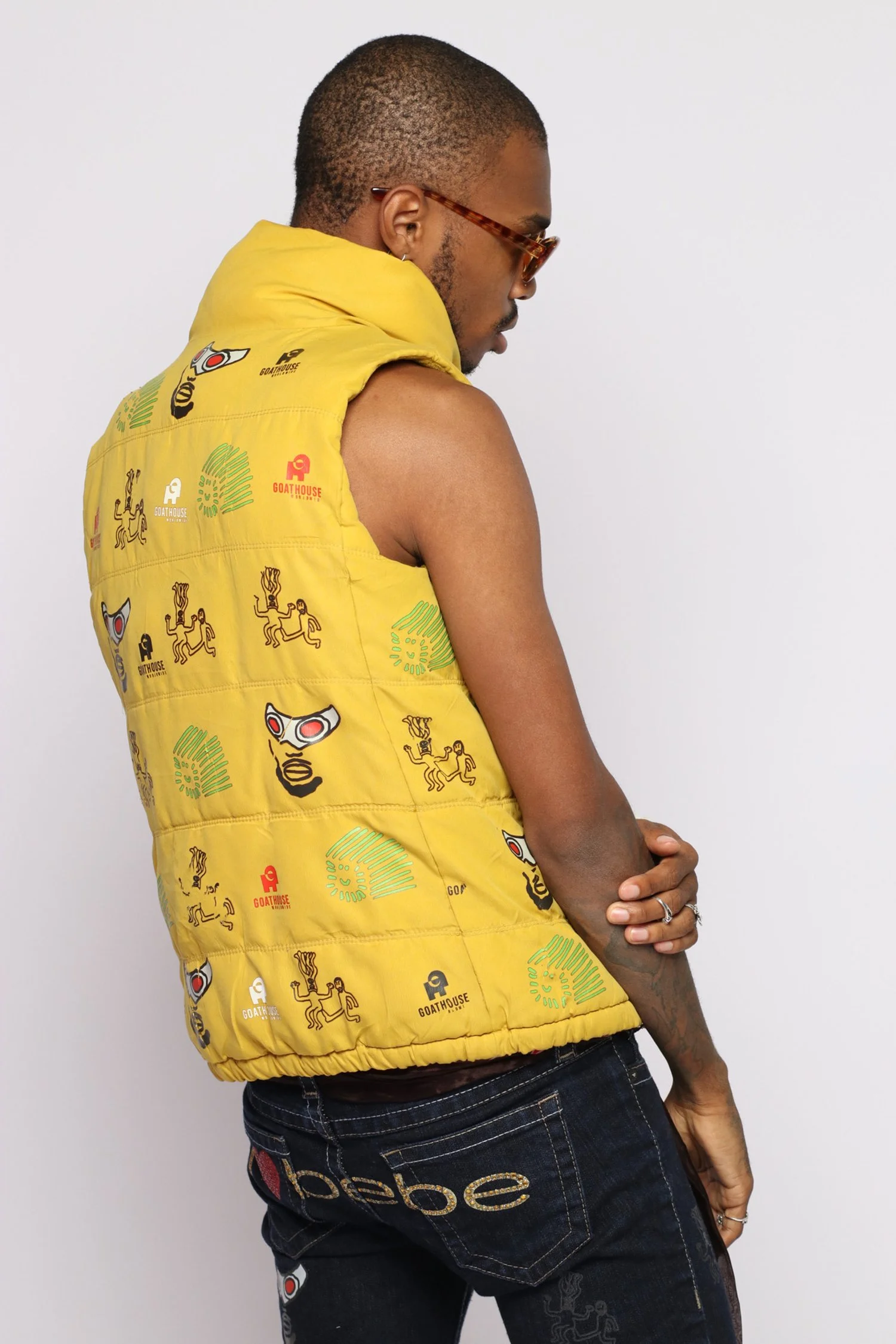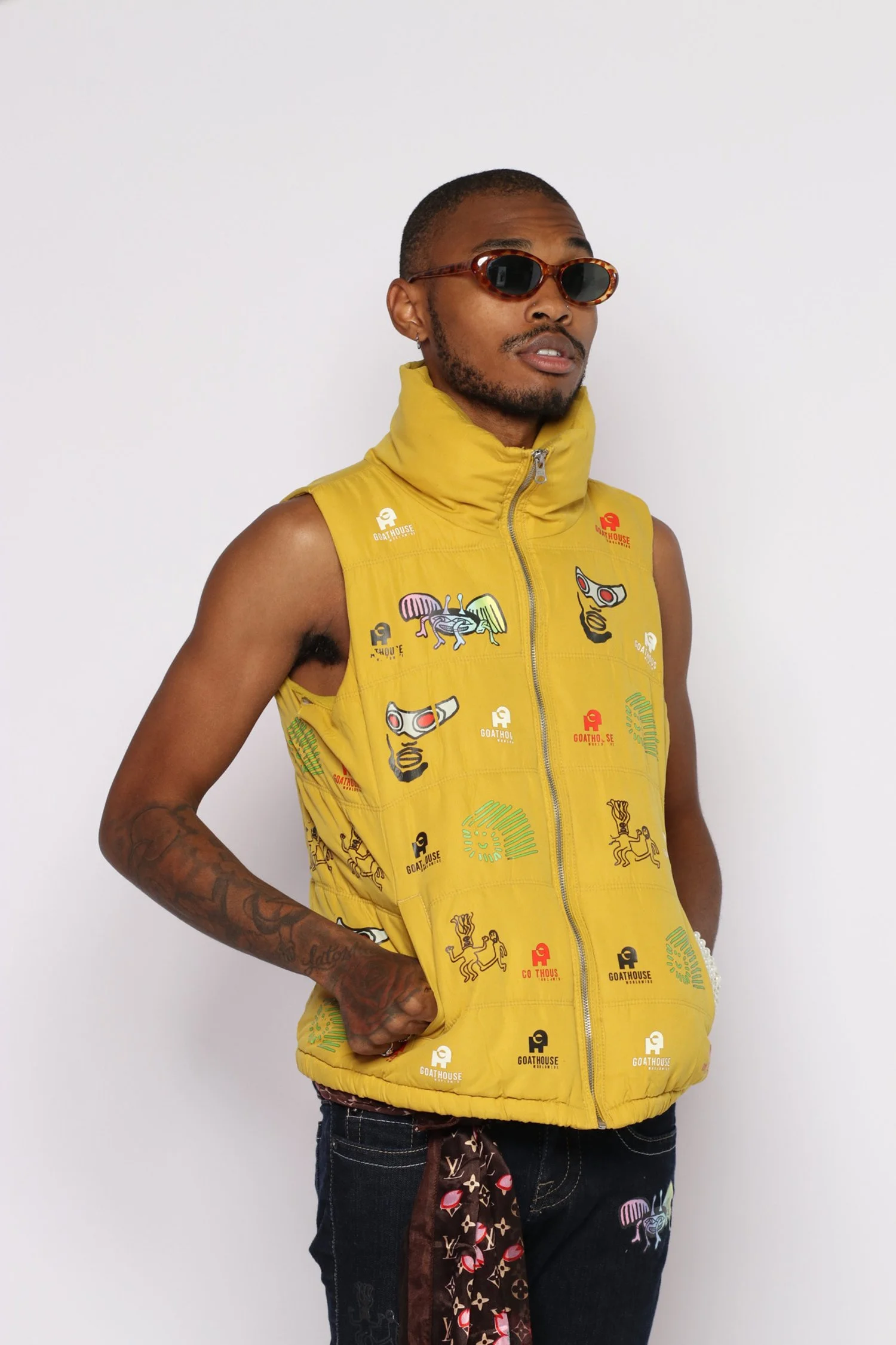A sleeveless zip-up vest designed by GOATBOY, featuring a vibrant yellow color and adorned with GOATWRLD logos throughout. Eye-catching design with a bold yellow color and GOATWRLD logos covering the surface, making a statement piece that represents the brand's aesthetic.