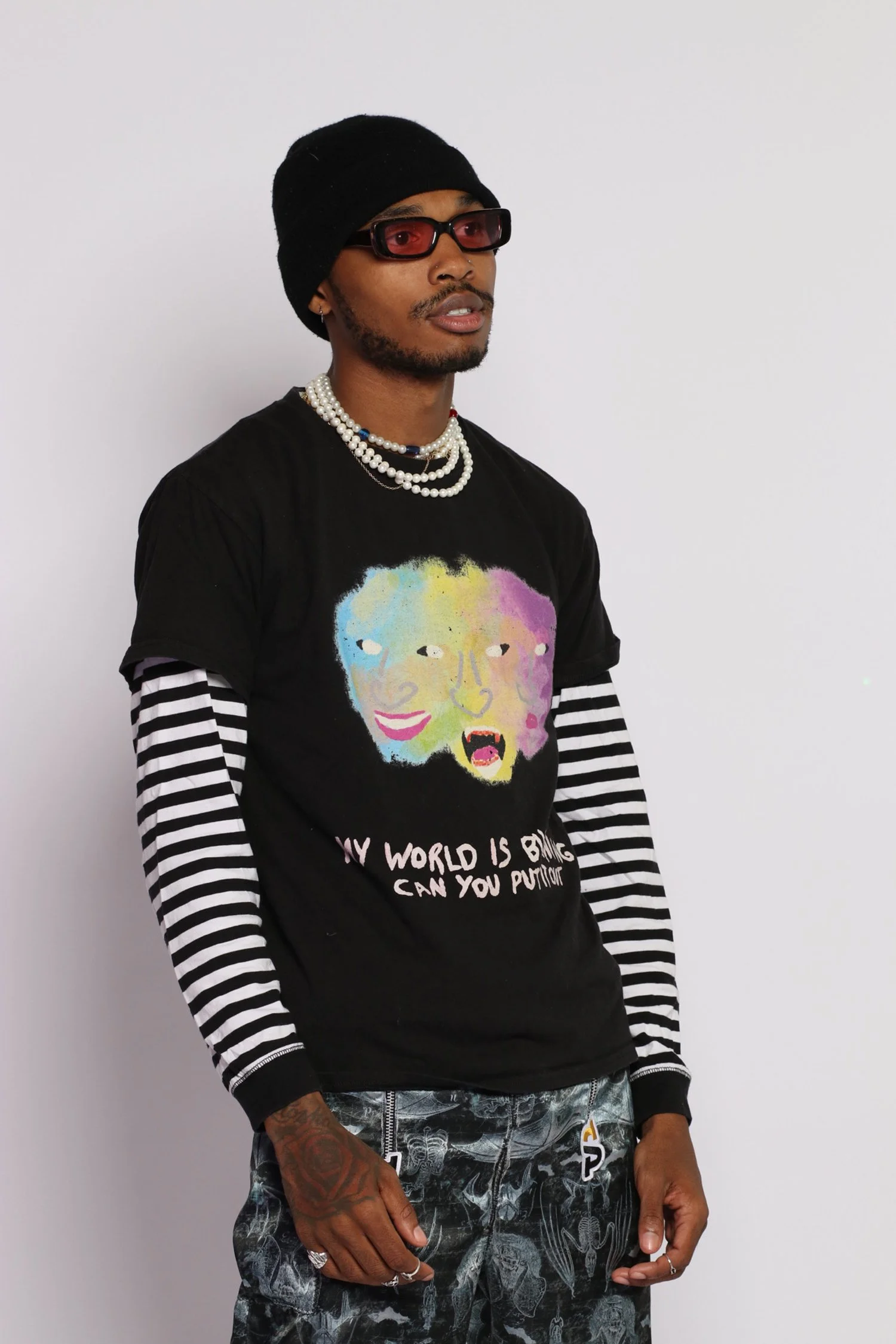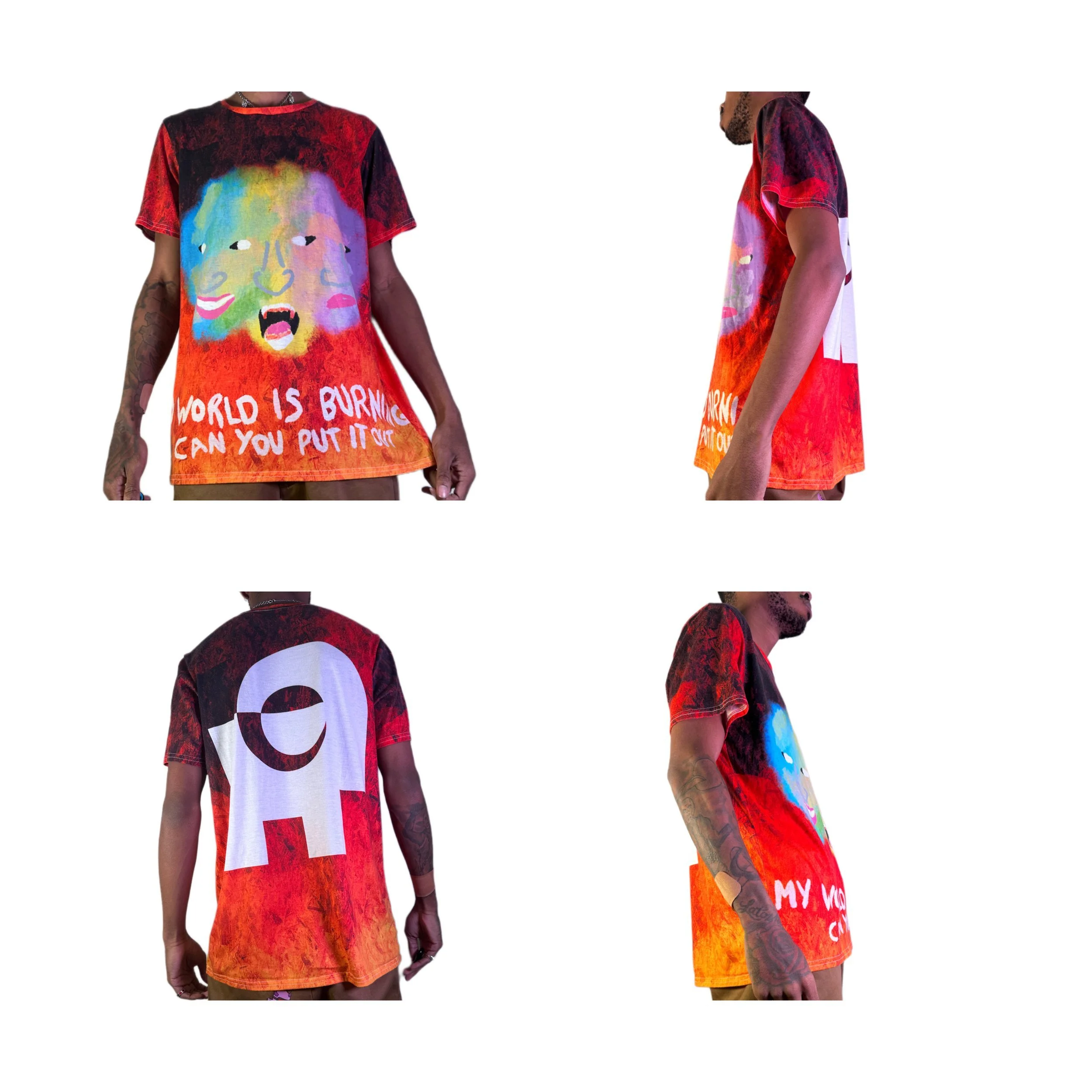 Bold graphic design featuring the text "MY WORLD IS BURNING CAN YOU PUT IT OUT" emblazoned across the front, making a powerful statement.