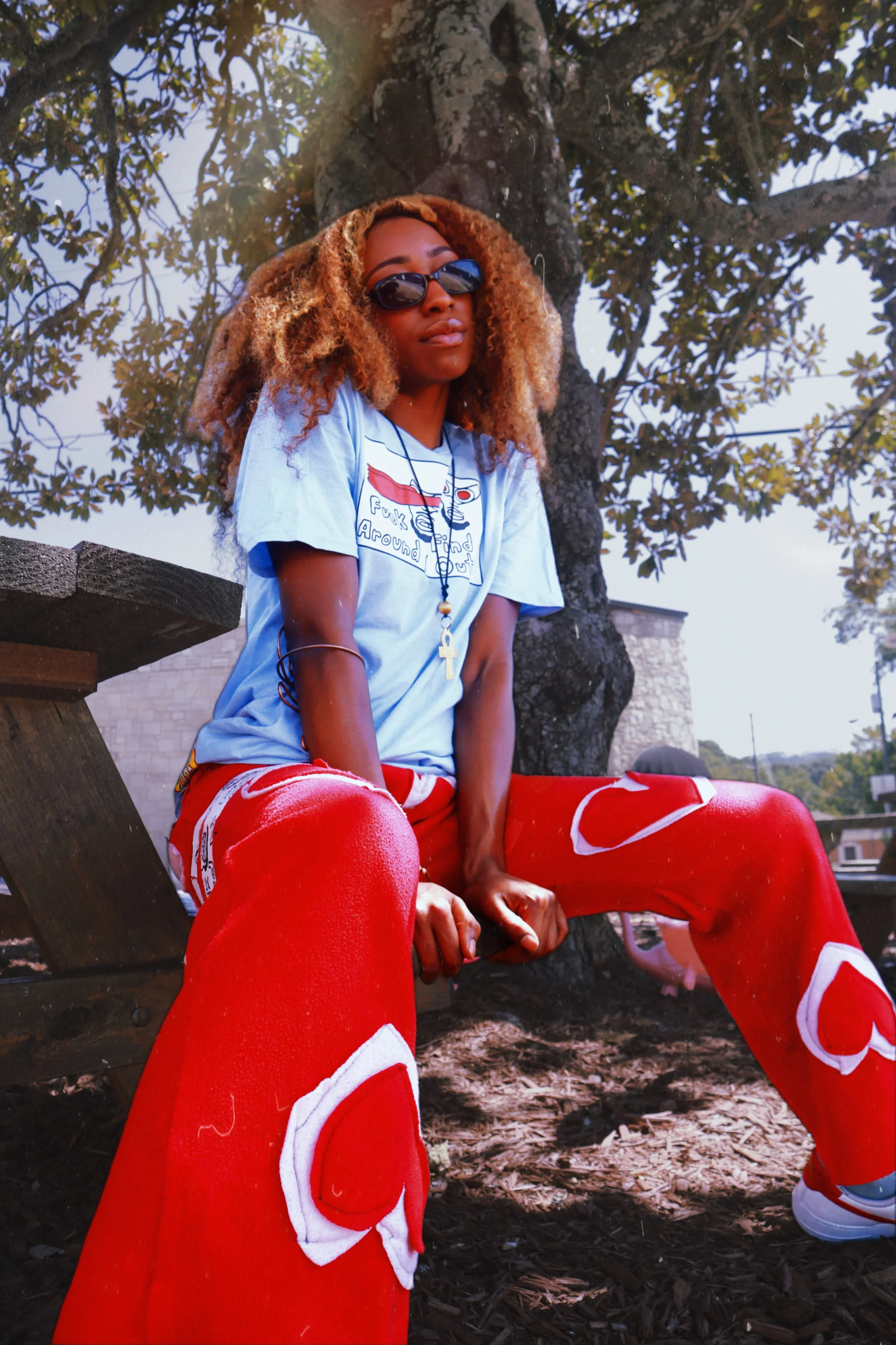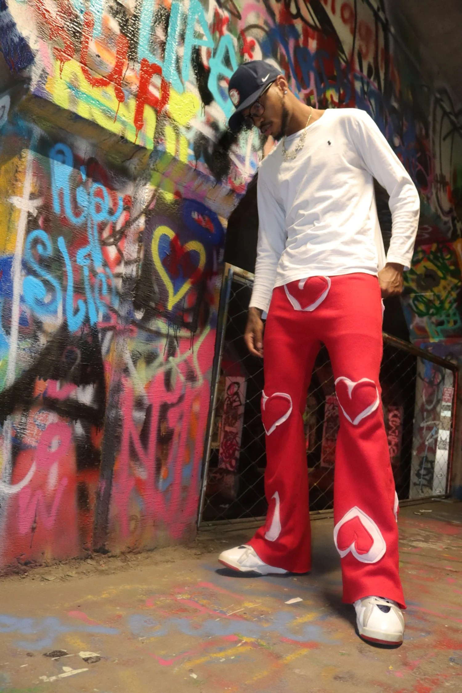 Bell-bottom sweatpants made from thick red fabric, adorned with heart motifs. Bell-bottom silhouette with heart motifs for a simple yet striking design.