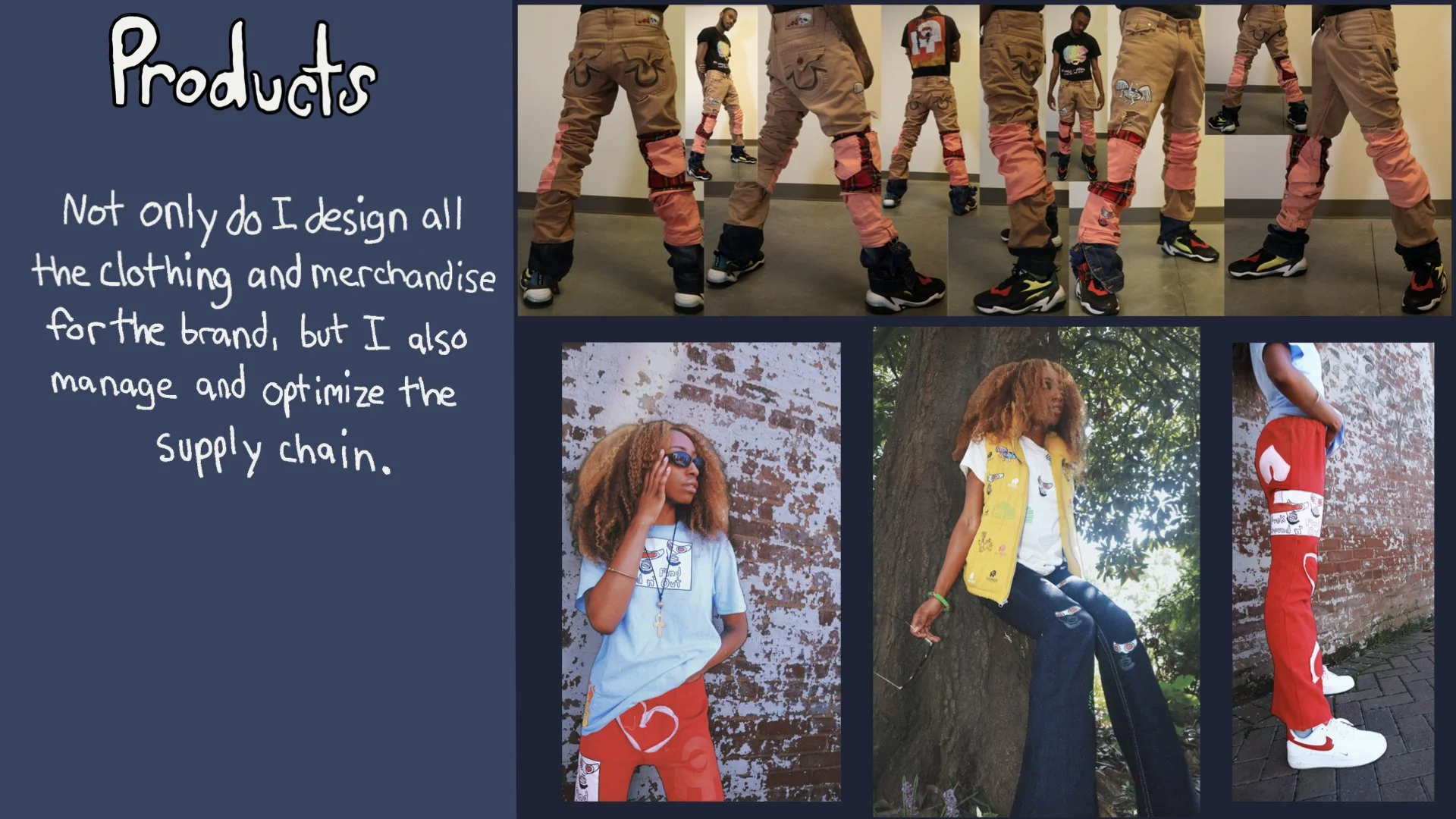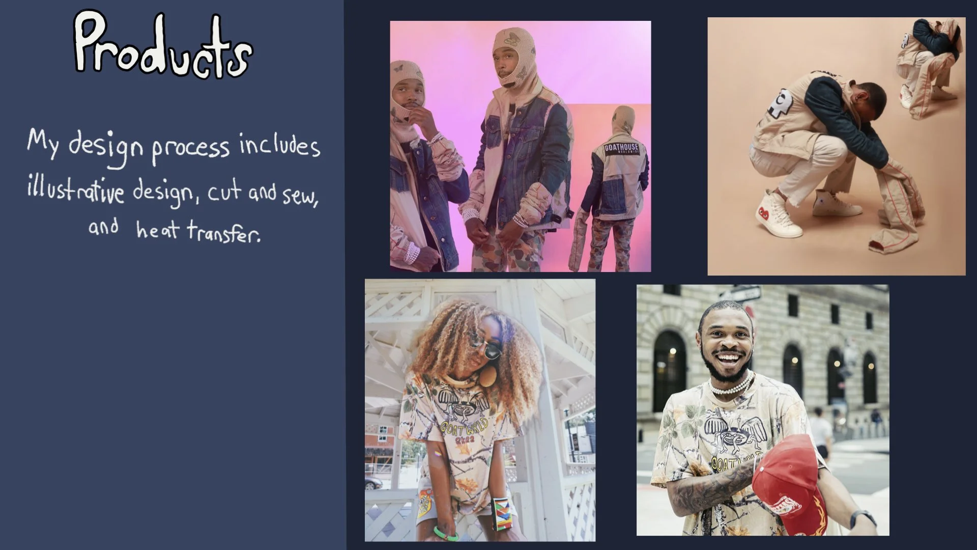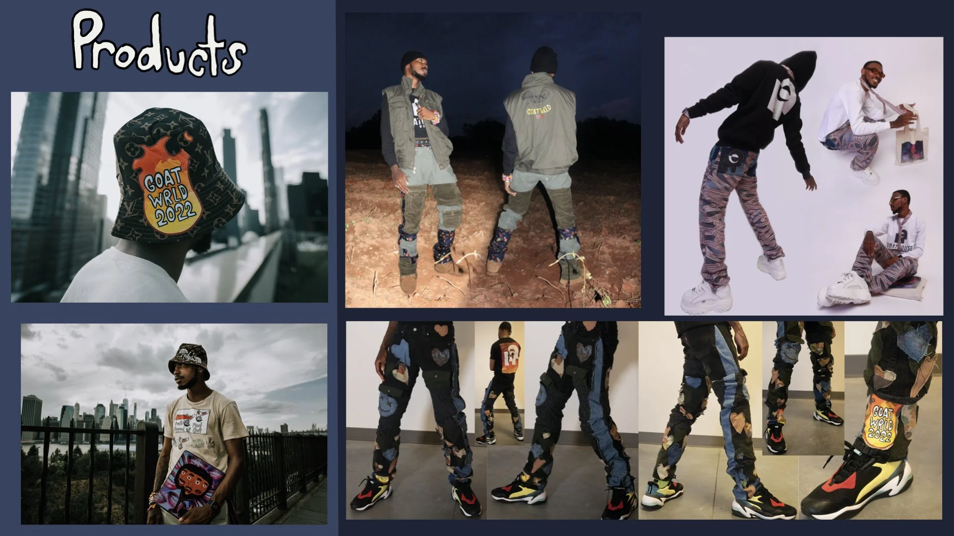 Showcase of flashy, high-fashion designs blending streetwear with luxury materials