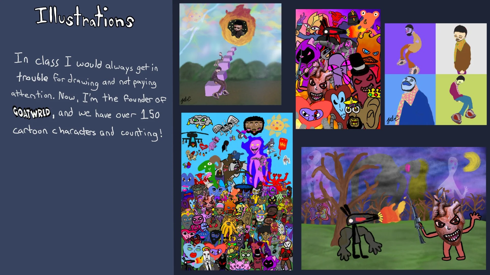Within two months of crafting his inaugural beat, an internship at a local music studio propelled him toward entrepreneurship. Music opened doors to three years of artistic exploration, including photography, clothing design, and event organization, further enriching his creative palette. During 2020, in the midst of a global pandemic, GOATWRLD was born out of a lifelong admiration for colorful cartoons and vivid storytelling.